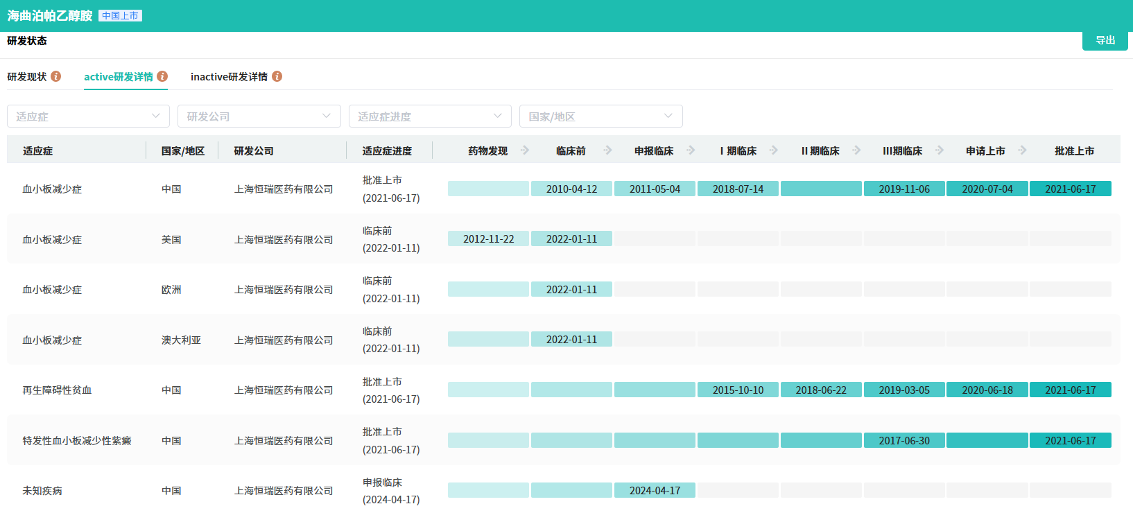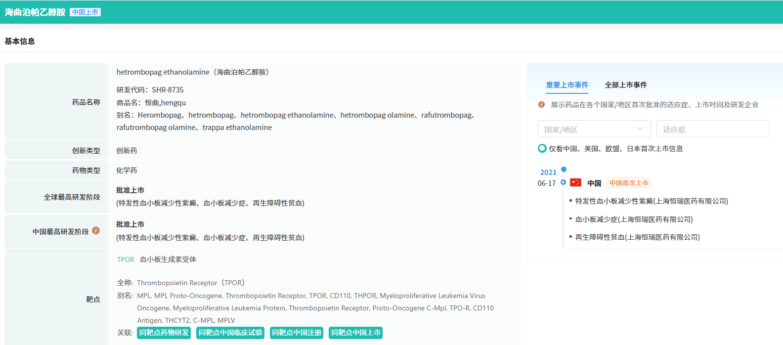 海曲泊帕乙醇胺作为新一代TPO-R激动剂,可通过激活TPO-R介导的STAT和MAPK信号转导通路,促进血小板生成。在第一代 TPO-RA产品的基础结构上,海曲泊帕进行了一系列修饰得到高选择性TPO-R激动剂,具备高效、低毒的特点。该产品此前已于2021年6月获NMPA批准两个适应症,分别用于既往对糖皮质激素、免疫球蛋白等治疗反应不佳的慢性原发免疫性血小板减少症成人患者的治疗,以及用于对免疫抑制治疗疗效不佳的重型再生障碍性贫血成人患者的治疗。